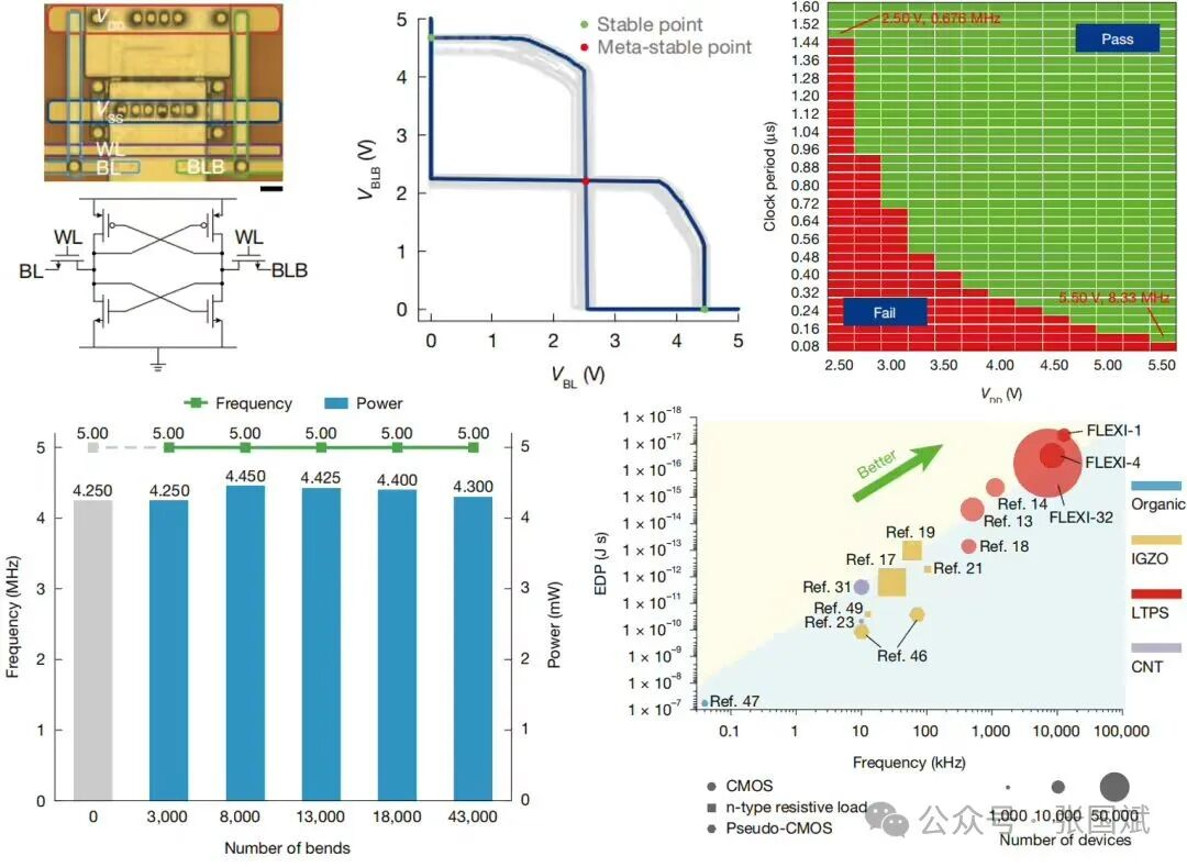 实验结果表明,FLEXI 芯片可在 2.5–5.5 V 电源电压范围内稳定工作,并在半径 1 mm、180° 对折条件下经受超过 4 万次弯折循环而性能无明显退化。
