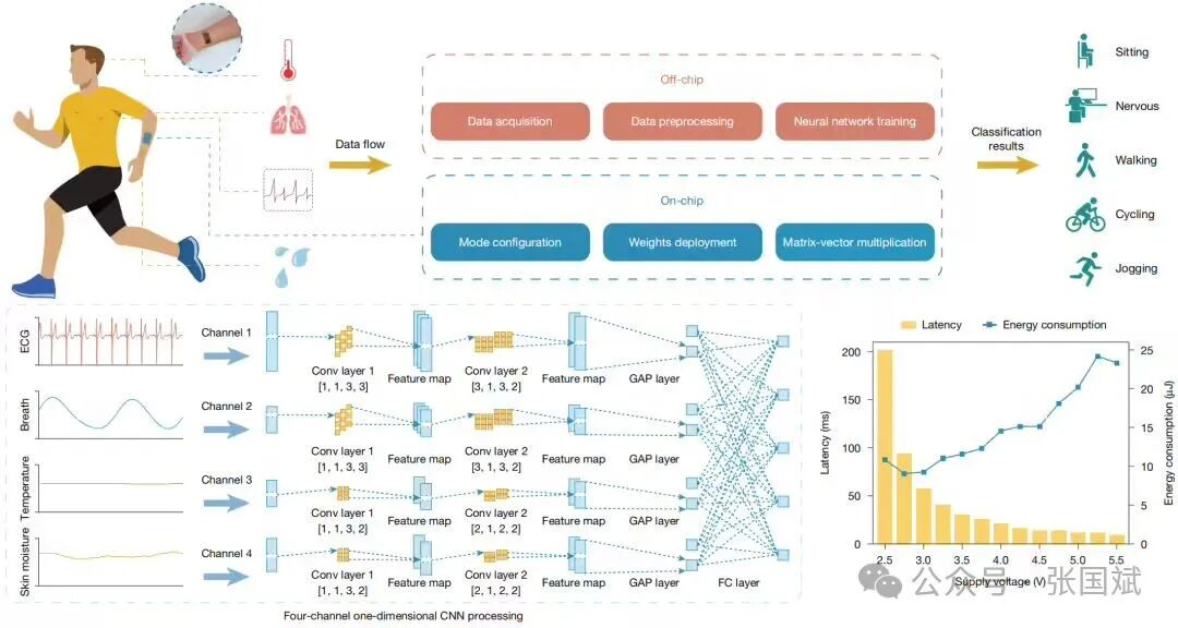在应用验证方面,研究团队将 FLEXI 用于日常活动的连续监测与识别,展示了其在可穿戴健康监测和多模态传感器内计算中的应用前景。团队采集了受试者在不同状态下的心率、呼吸频率、体温和皮肤水分等多模态生理信号,构建了轻量级四通道卷积神经网络,并在 FLEXI-1 上实现一次性片上部署。通过量化感知训练,该模型在测试集上实现了 97.4% 的分类准确率。